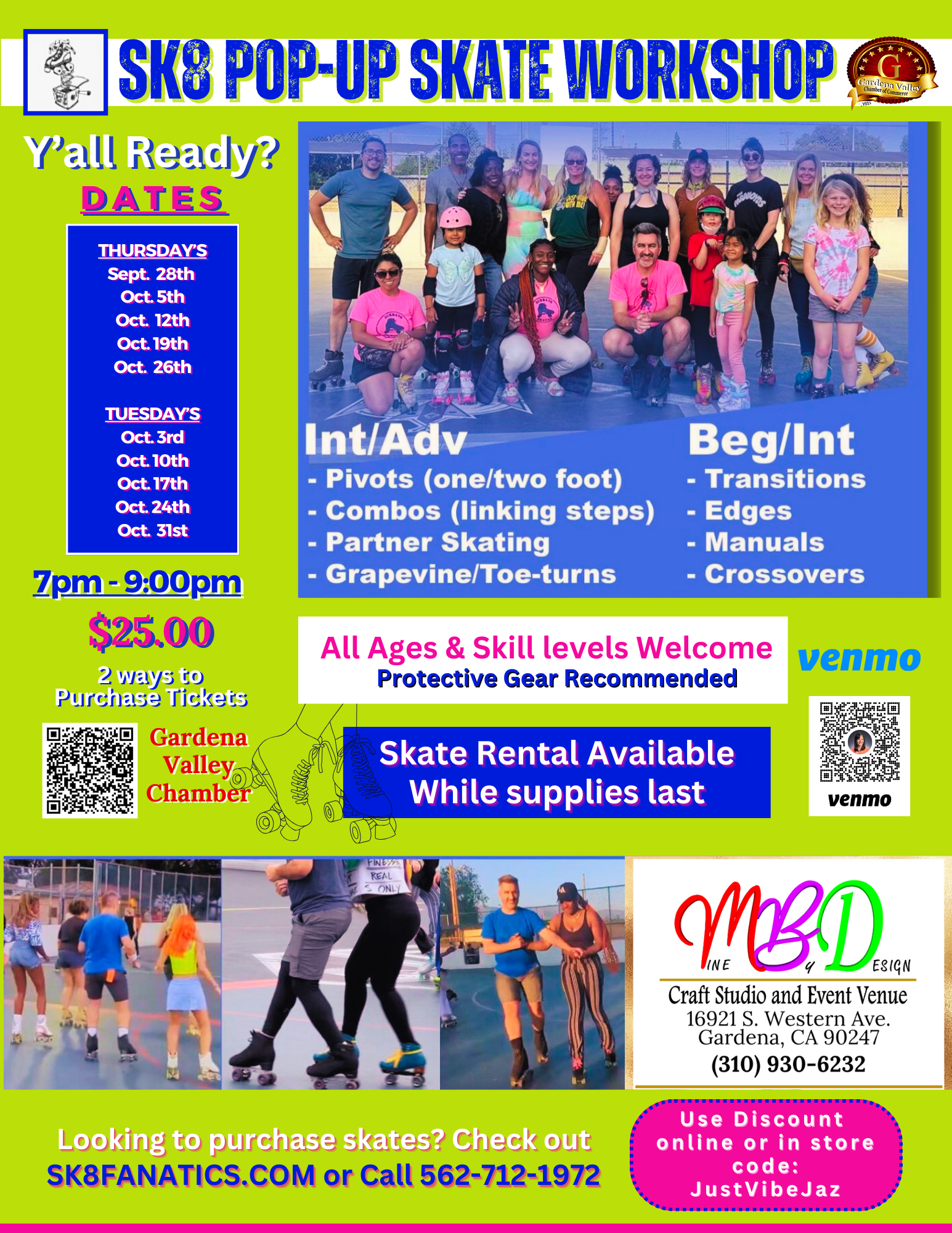 Join us for an exciting and fun-filled evening at the Pop-Up Roller Skate Workshop EVERY THURSDAY! Lace up your skates and get ready to roll into an unforgettable experience. Whether you're a beginner or a seasoned skater, this event is perfect for you.