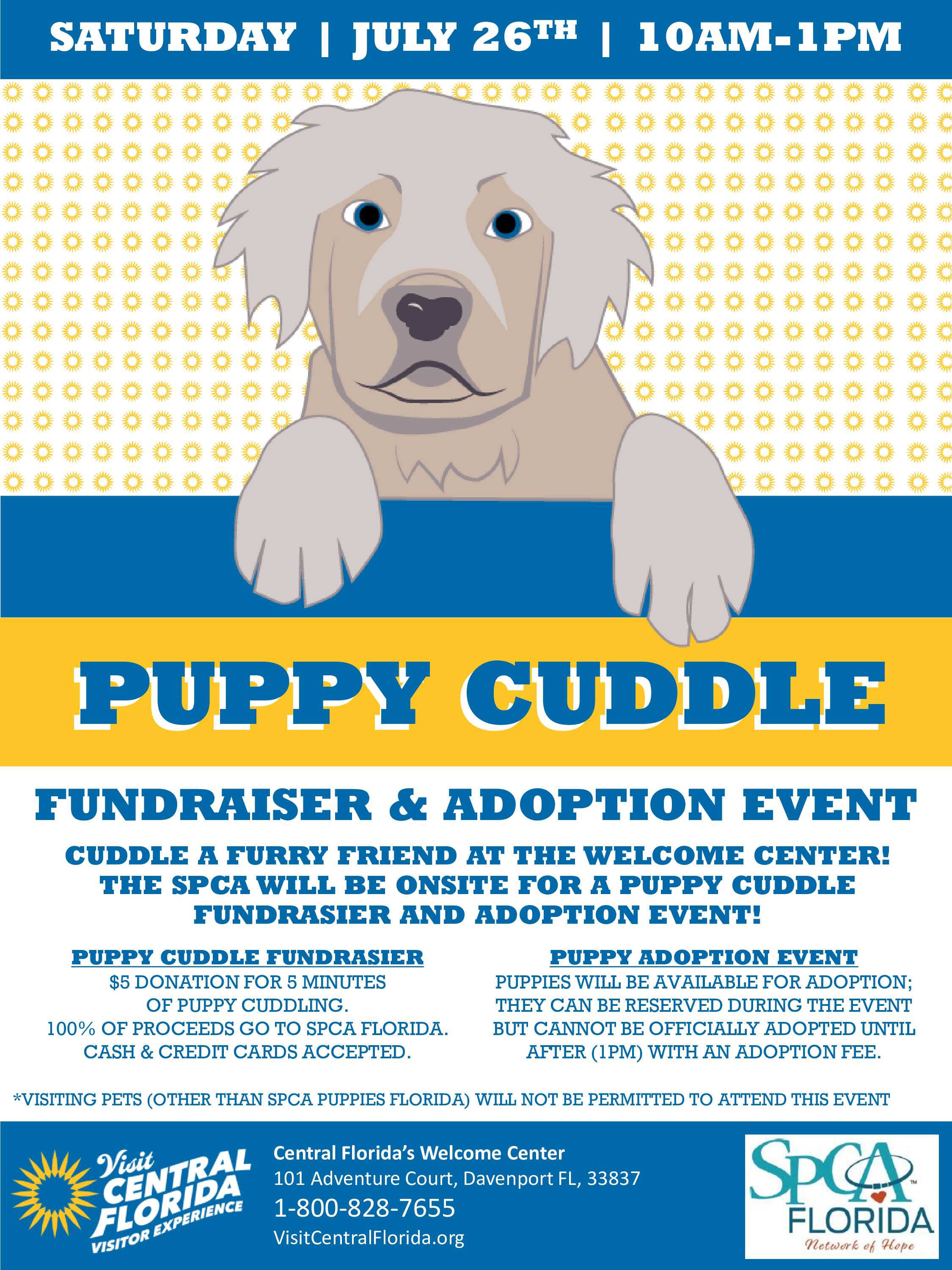 Puppy Cuddle Fundraiser & Adoption Event at Visit Central Florida Welcome Center - Saturday, July 26th, 10 a.m. - 1 p.m., 101 Adventure Ct., Davenport, FL 33837 - Click HERE for the flyer & more info!