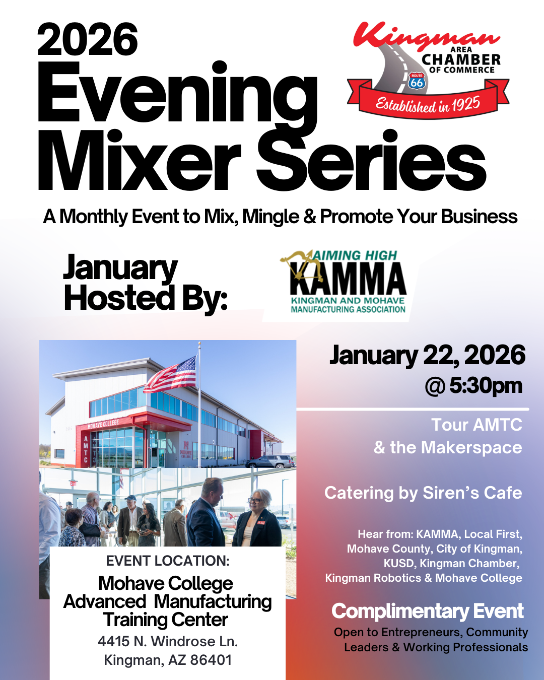 Join the Kingman Area Chamber of Commerce for our January Evening Mixer, part of the 2026 Evening Mixer Series—a monthly opportunity to mix, mingle, and promote your business. This mixer is hosted by Kingman and Mohave Manufacturing Association (KAMMA) at the Advanced Manufacturing Training Center at the Kingman Airport Industrial Park.