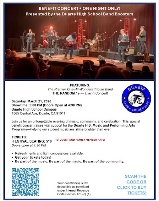 Join us for an unforgettable evening of music, community, and celebration! This special benefit concert raises vital support for the Duarte H.S. Music and Performing Arts Programs —helping our student musicians shine brighter than ever.