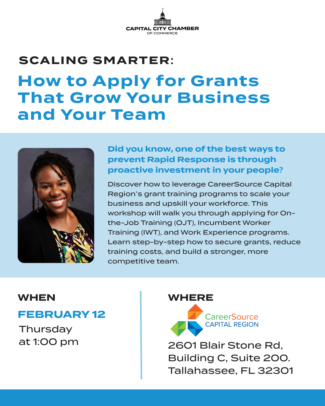 Discover how to leverage CareerSource Capital Region’s grant training programs to scale your business and upskill your workforce. This workshop will walk you through applying for On-the-Job Training (OJT), Incumbent Worker Training (IWT), and Work Experience programs. Learn step-by-step how to secure grants, reduce training costs, and build a stronger, more competitive team.
