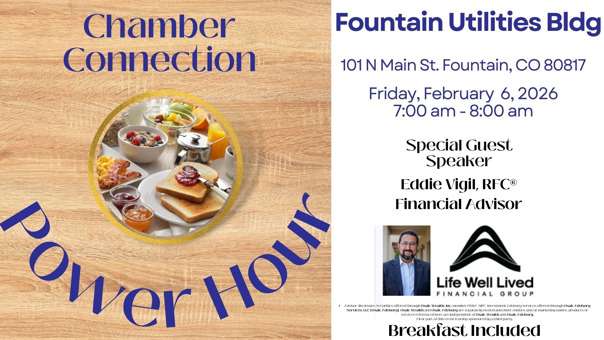 Event Name: Connection Power Hour Description Event Date: 02-06-26 Event Time: 07:00 AM - 08:00 AM MST Location: Fountain Utility Building 101 N. Main St. Fountain, CO 80817 Contact Person: Fountain Valley Chamber of Commerce Office (phone: 719-393-4990)