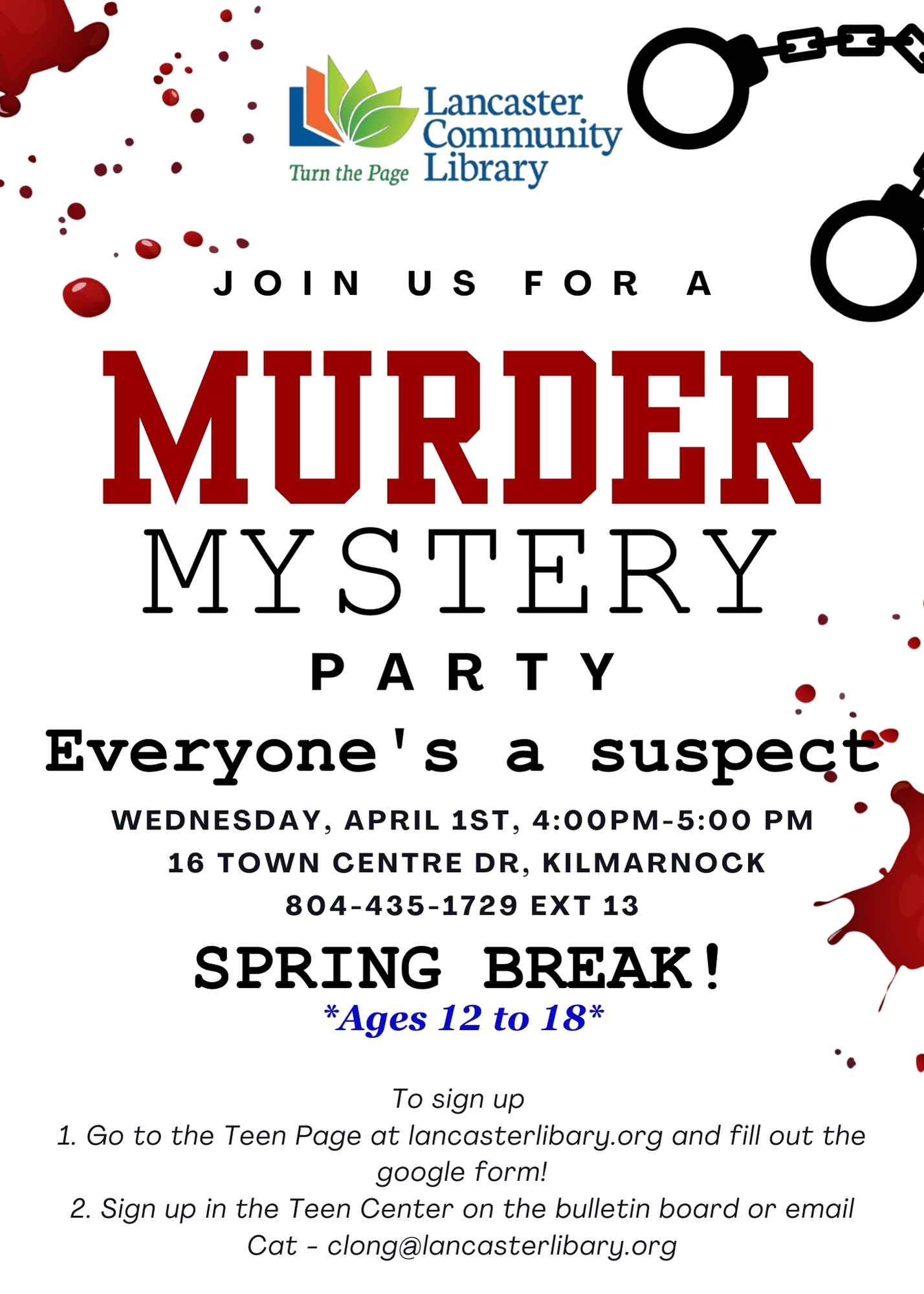 Join us for an afternoon of secrets, clues, and dramatic plot twists at our Spring Break Murder Mystery Party!