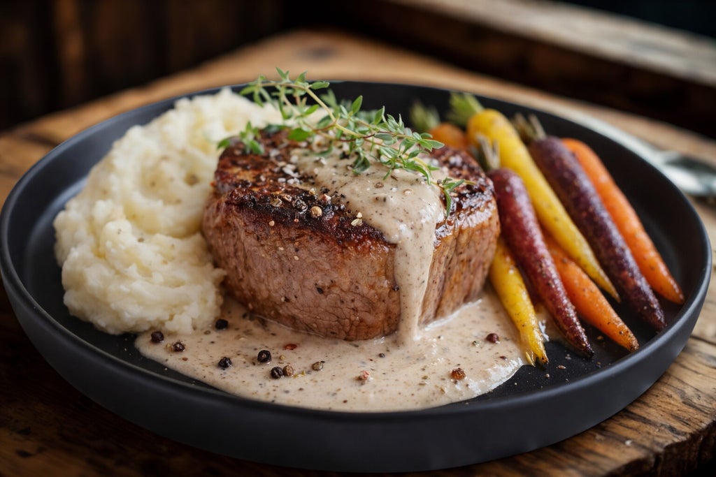 Hand-cut Filet Mignon Au Poivre with a cracked peppercorn brandy sauce served alongside herbed garlic mashed potatoes and roasted rainbow carrots.