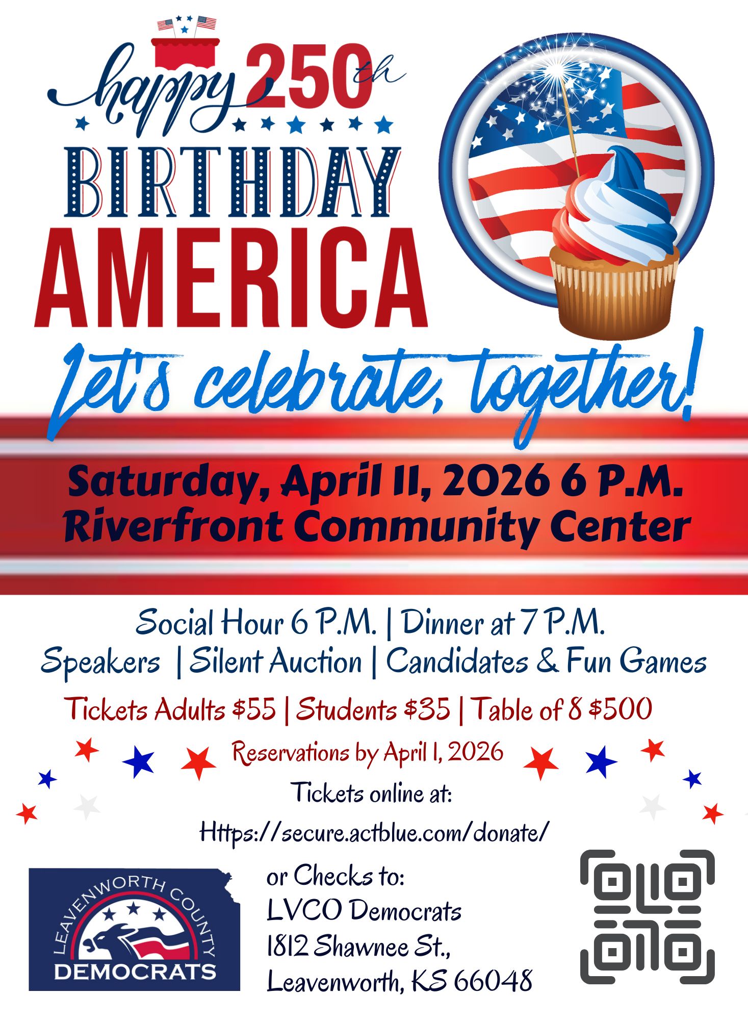 Happy 250th Birthday America! Come celebrate with the Leavenworth County Democrats as we celebrate our nation's birth at the Riverfront Community Center on Saturday, April 11 at 6:00 PM with a social hour, dinner, guest speakers, silent auction, and party games for everyone!