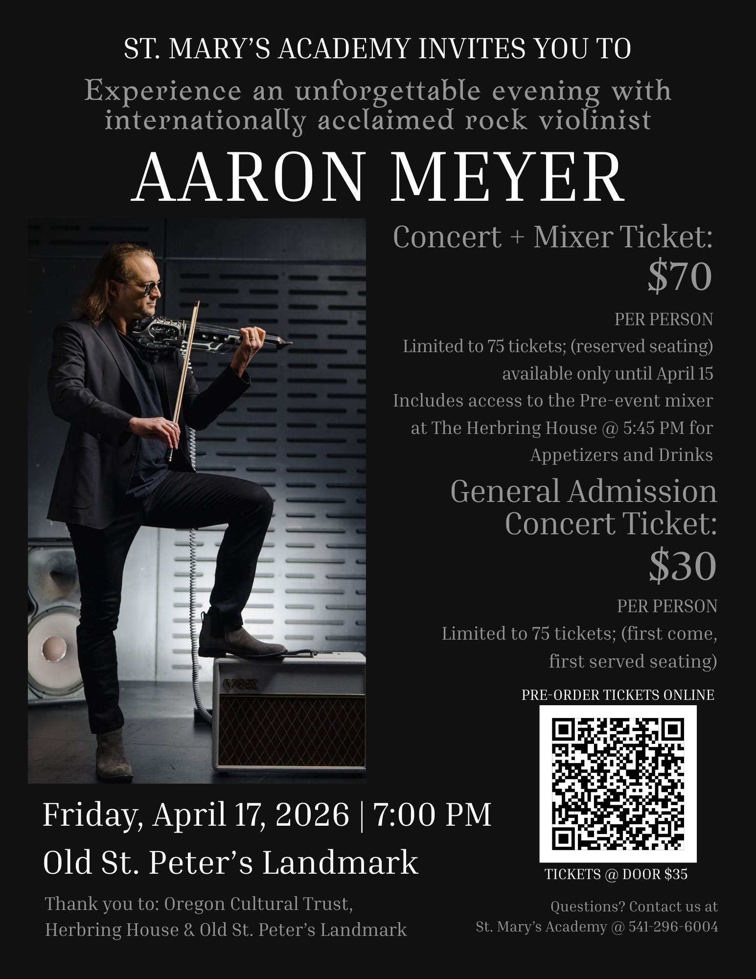 St. Mary’s Academy invites the community to an unforgettable evening of music featuring internationally acclaimed rock violinist Aaron Meyer on Friday, April 17, 2026, at 7:00 p.m. at Old St. Peter’s Landmark.
