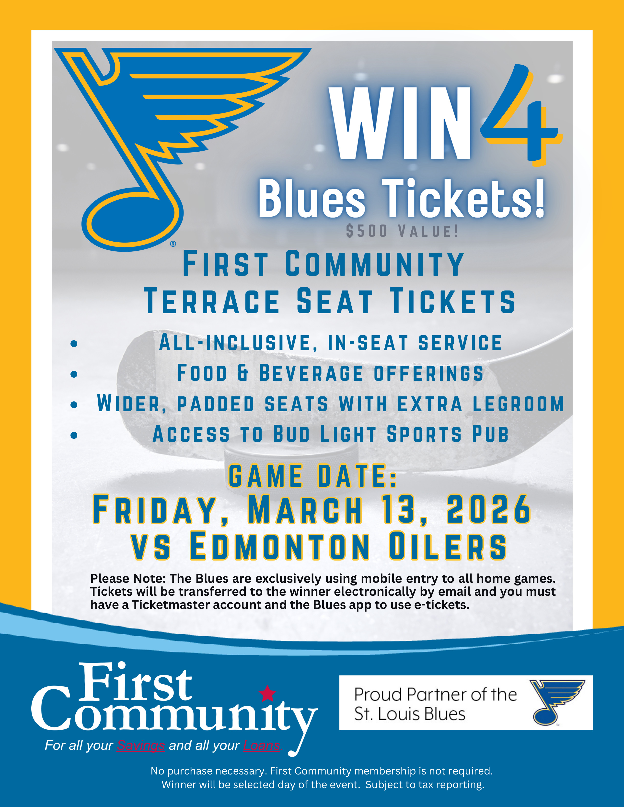 Attendees will have the opportunity to win a set of 4 tickets to the St. Louis Blues Game on March 13, 2026. Winner will be announced during the host comments. Must be present to win.