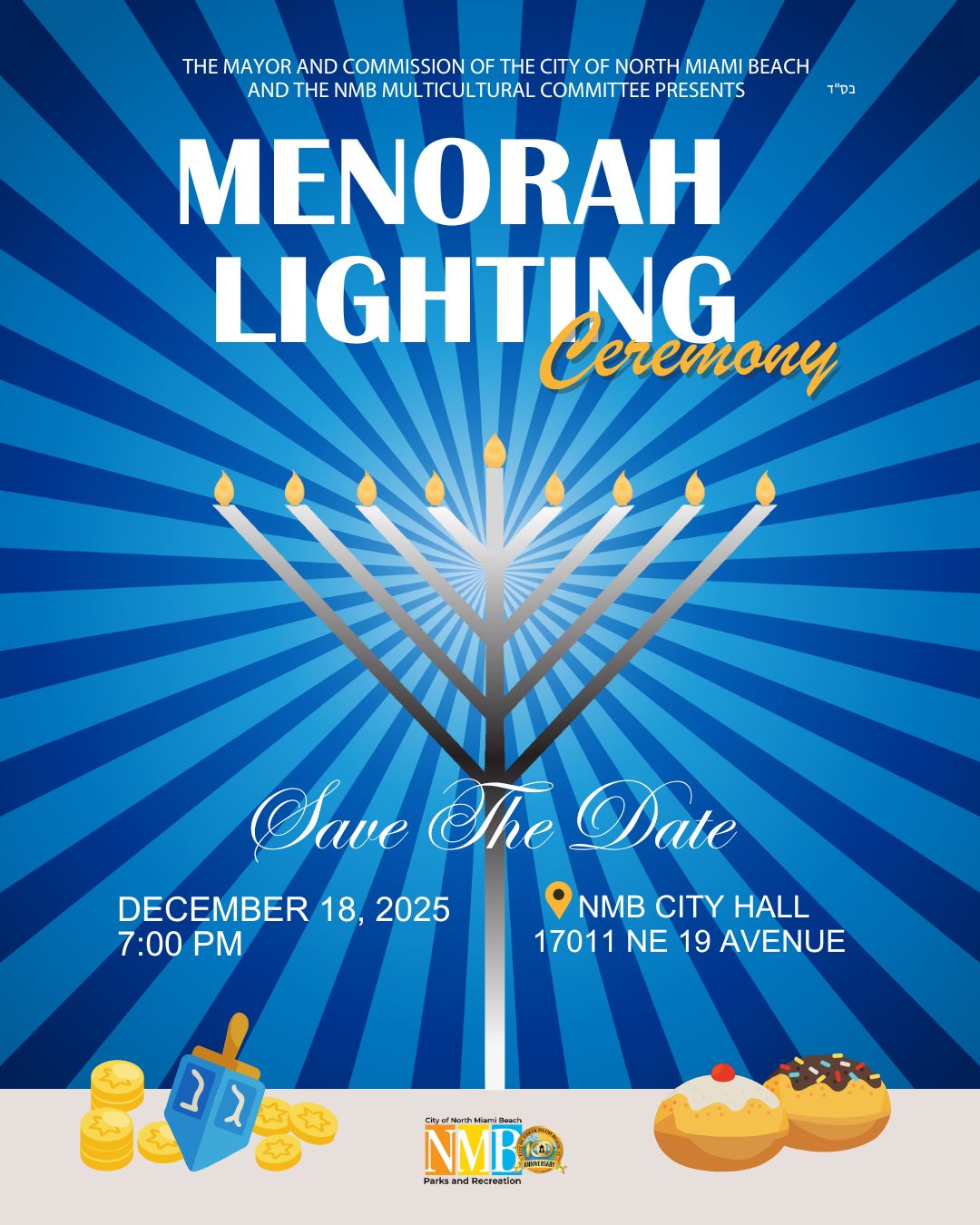 December 18 at 7 PM at North Miami Beach City Hall. Come together with family, friends, and neighbors to celebrate the season with light, community, and cherished traditions. Enjoy a festive evening filled with warmth and holiday spirit. For more information, contact NMB Parks and Recreation at 305-948-2957.