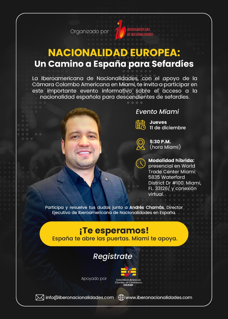 La Iberoamericana de Nacionalidades, con el apoyo de la Cámara de Comercio Colombo Americana en Miami, te invita a participar en este importante evento informativo sobre el acceso a la nacionalidad española para descendientes sefardíes.