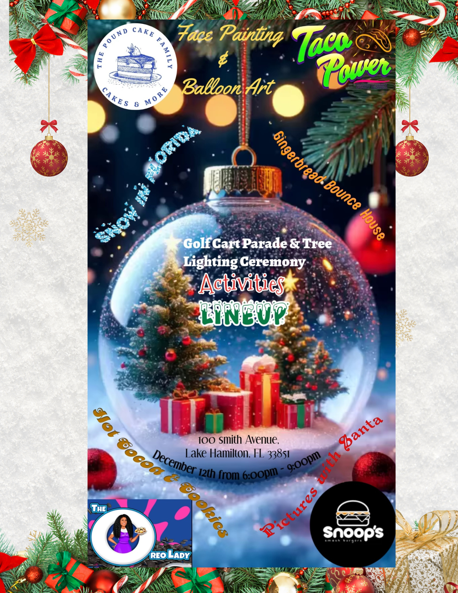 Town of Lake Hamilton Golf Cart Parade & Christmas Tree Lighting - Friday, December 12th, 6 -9 p.m., 100 West Smith Ave., Lake Hamilton, FL. Participants staging starts at 5:15 p.m.; Parade starts at 6 p.m. Face Painting, Balloon Art, Gingerbread Bounce House, Hot Cocoa & Cookies, Pictures with Santa & Snow! Click HERE for the flyer and more info.