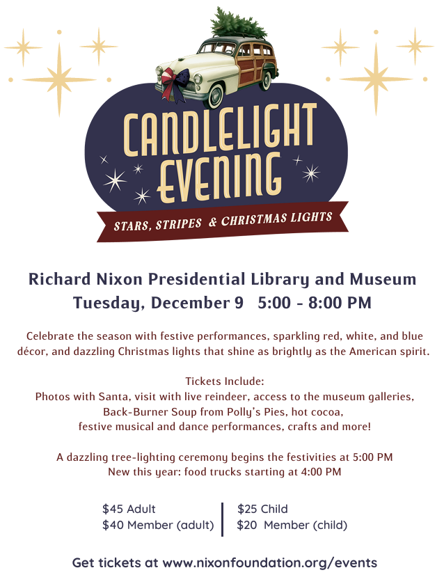 Make lasting holiday memories by taking a photo with Santa, visiting his reindeer, and joining a joyful celebration filled with seasonal music and patriotic sparkle. Sip hot cocoa as you stroll the Library’s gardens by candlelight and savor Back-Burner Soup from Polly’s Pies.