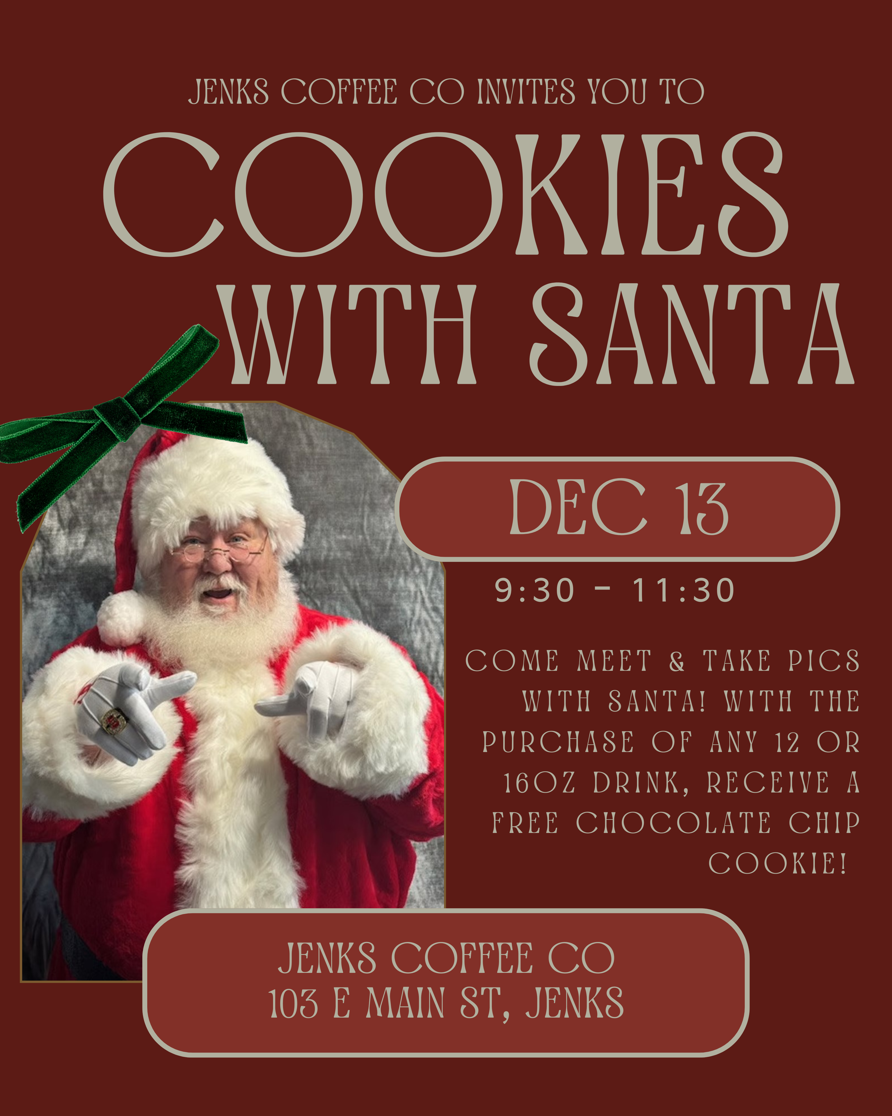 Buy any 12oz or 16oz drink & enjoy a free chocolate chip cookie while your little ones meet the big guy himself. 🍪