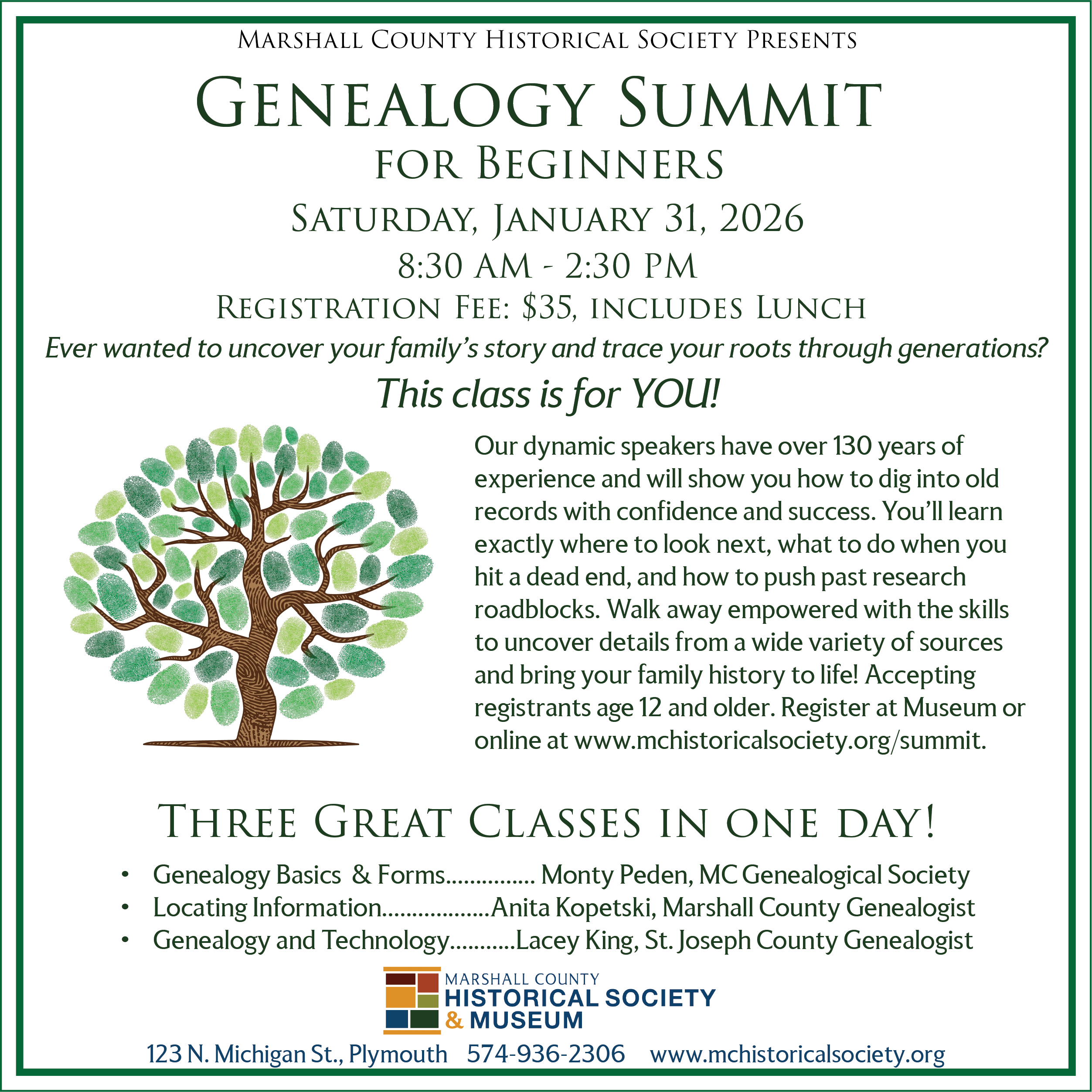 Every family has a story – what’s yours? Join us to learn how to trace your roots, uncover hidden stories and confidently research records across generations. The Marshall County Historical Society will present its first “Genealogy Summit for Beginners” on January 31, 2026.