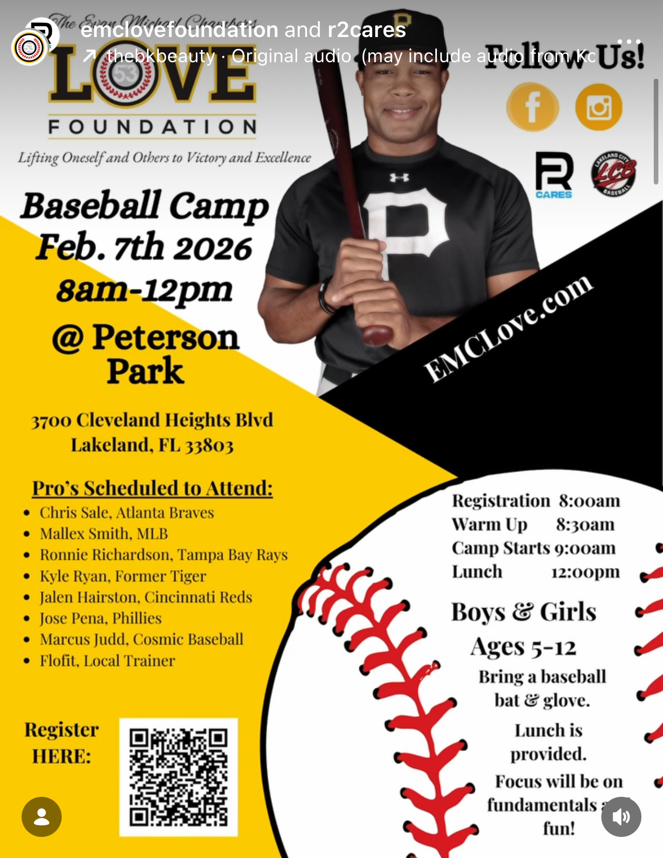 R2 Cares Baseball Camp - February 7th - 8 a.m. - 12 p.m., Peterson Park, 3700 Cleveland Heights Blvd., Lakeland, FL 33803 - Boys & Girls ages 5 - 12 - Pros scheduled to attend! $25 early bird registration by Jan. 12th. Click HERE to register online or scan the QR code on the flyer.