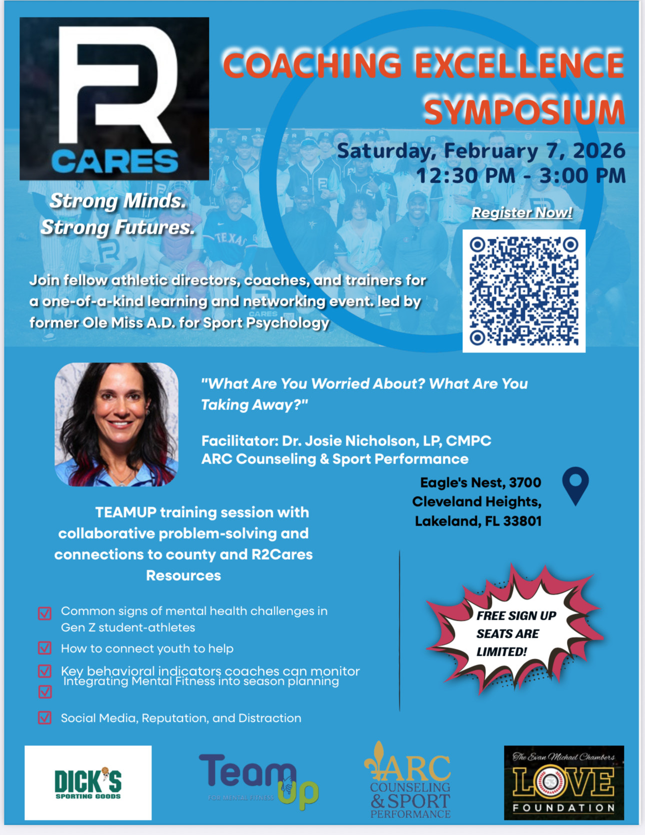 R2 Cares Coaching Excellence Symposium - Saturday, February 7th - 12:30 - 3 p.m., Eagle's Nest, 3700 Cleveland Heights, Lakeland, FL - Join fellow athletic directors, coaches, and trainers for a one-of-a-kind learning & networking event ledd by former Ole Miss A.D. flor Sport Psychology. Click HERE for the flyer and scan the QR code to register.