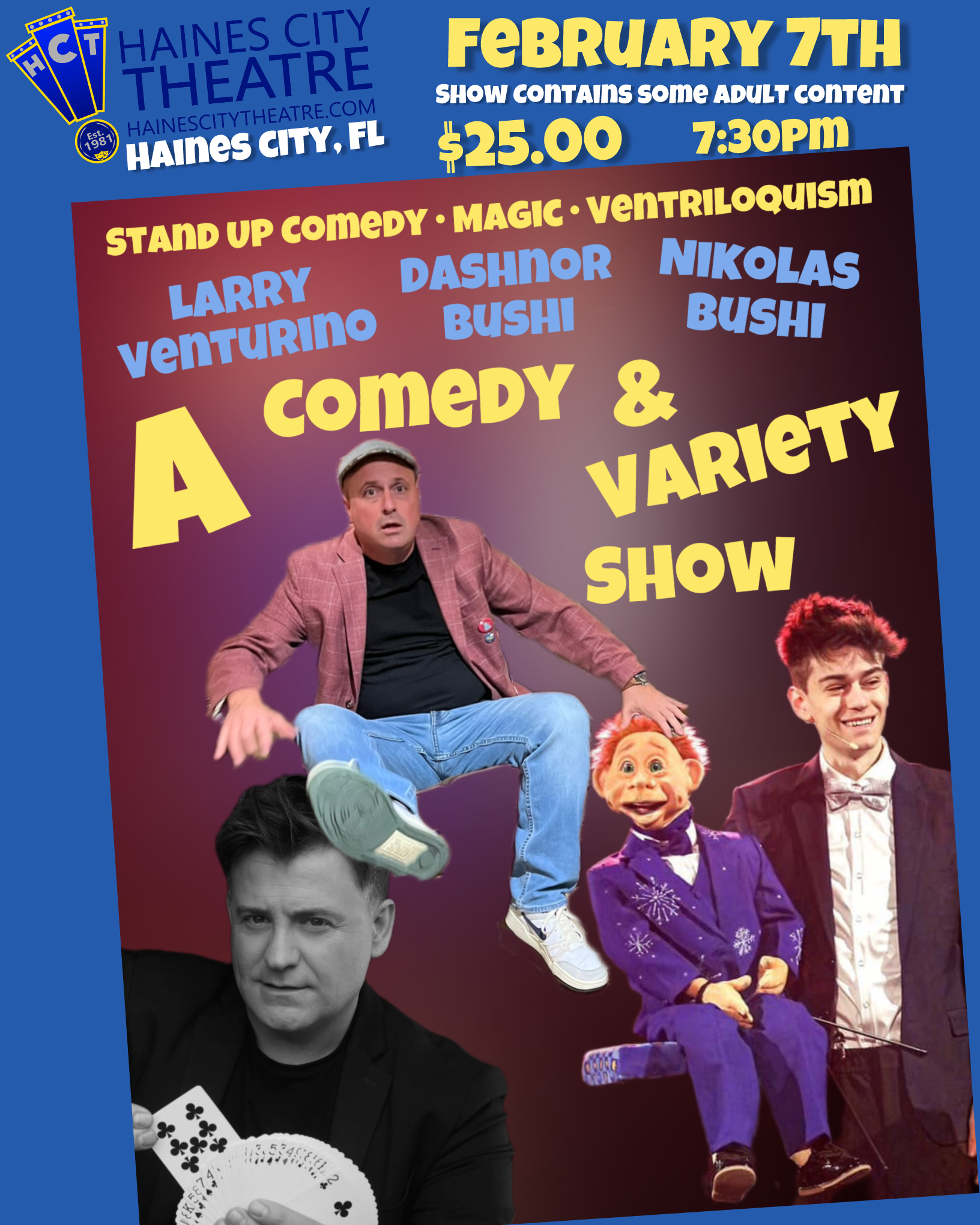 Join the Haines City Theatre for an evening of comedy, magic, and ventriloquism featuring nationally & internationally touring performers - Larry Venturino, Nikolas Bushi, and Dashnor Bushi. February 7th - 7:30 p.m. Visit https://www.hainescitytheatre.com/larry-venturino---a-comedy--variety-show.html for tickets & more info. Click HERE for the flyer.