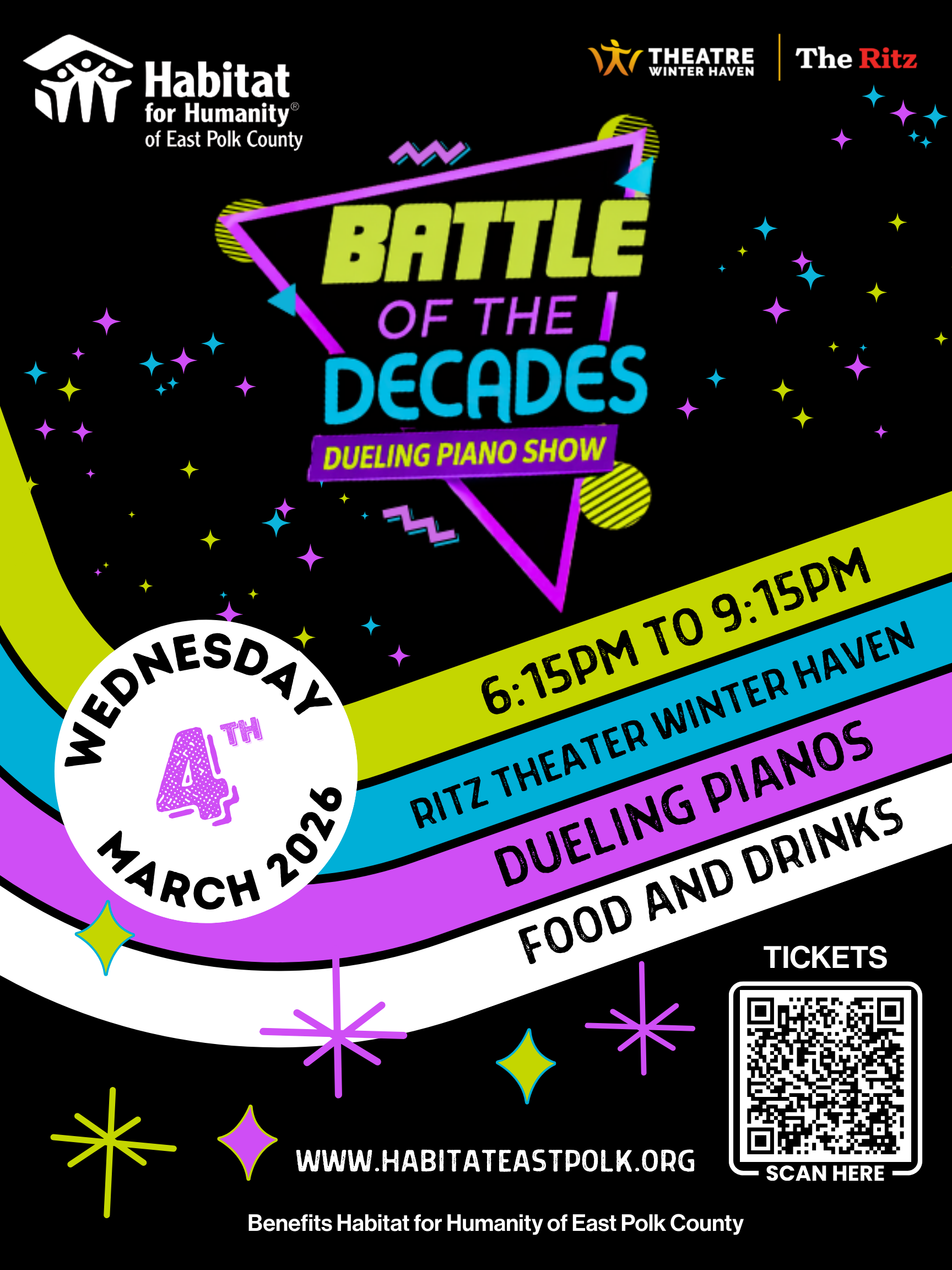 Habitat for Humanity of East Polk presents Battle of the Decades Dueling Piano Show - Wednesday, March 4th - 6:15 - 9:15 p.m. at the Ritz Theatre Winter Haven. Dueling Pianos, Food & Drinks! Scan the QR Code on the flyer for tickets or more info.