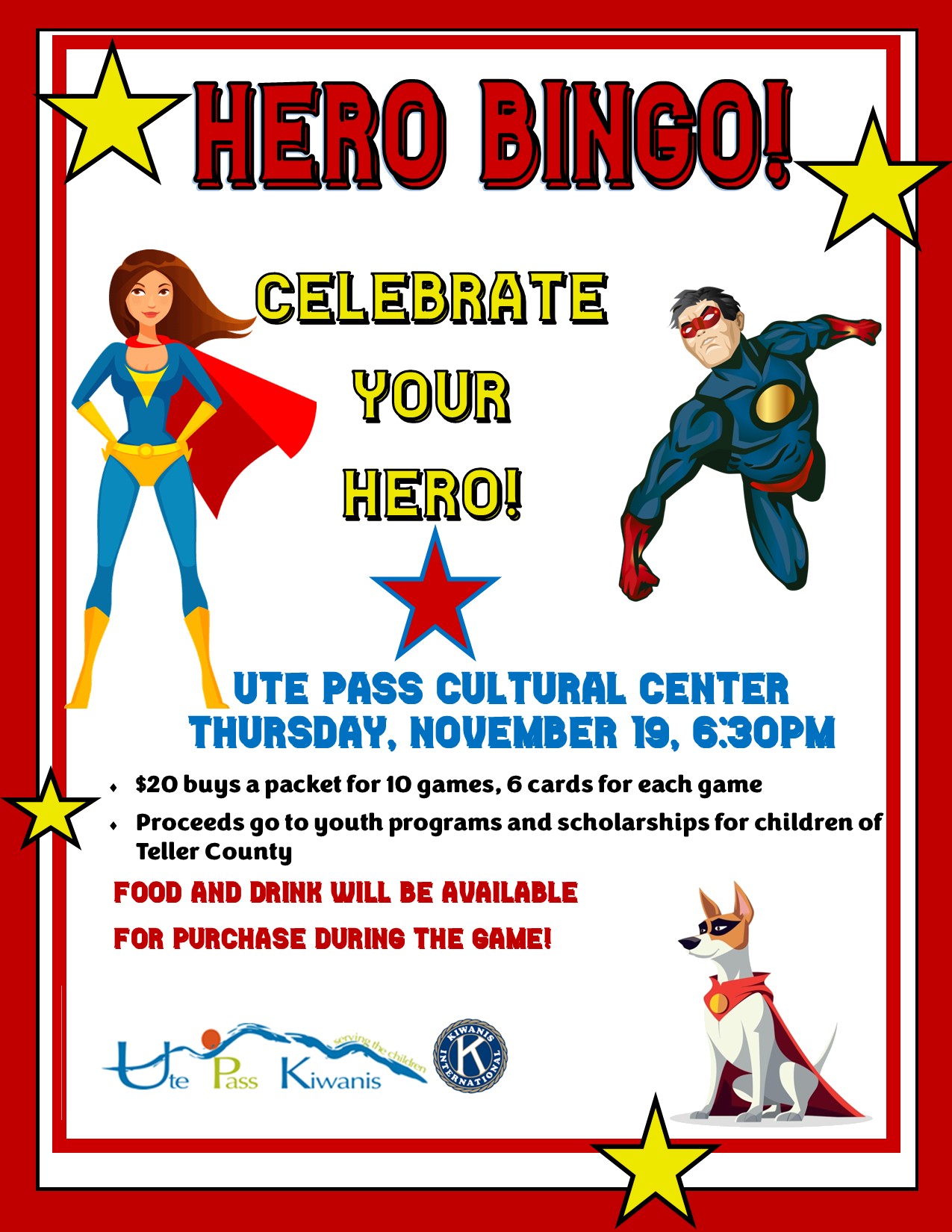 Come and celebrate your favorite hero! Maybe bring them to this bingo! $20 gets you 10 chances to win. Food and drink will be available for purchase. All proceeds benefit the children of Teller County.Links: