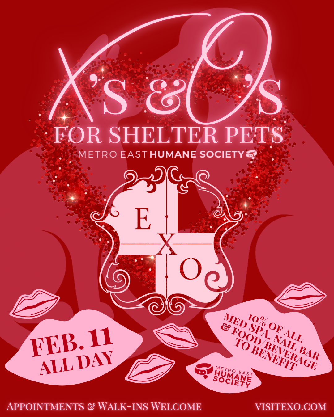Share some X's and O's with shelter pets during this giveback day at EXO. Visit EXO on February 11 and 10% of all med spa, nail bar & food/beverage purchases will be donated to the Metro East Humane Society. Appointments and walk-ins welcome. DJ Swag will be playing music from 3-8PM.