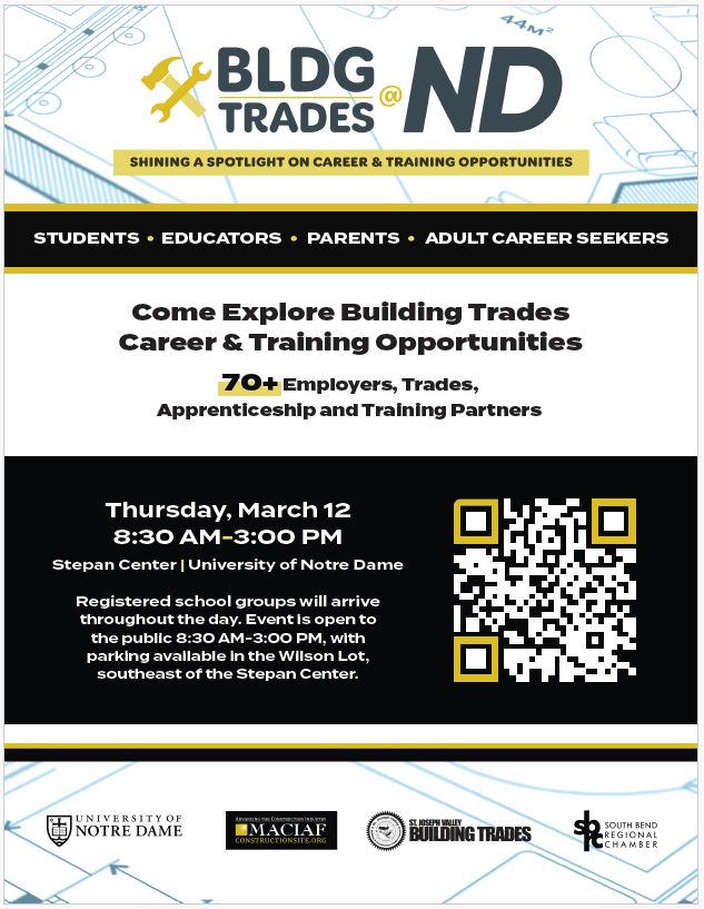 Want to learn more about building trades and construction-related career and training opportunities? Mark your calendar and join us for the third BLDG Trades Day @ ND on March 12. The South Bend Regional Chamber is excited to continue our collaboration with the University of Notre Dame, MICHIANA AREA CONSTRUCTION INDUSTRY ADVANCEMENT FUND (MACIAF), St. Joseph Valley Building Trades, and 70+ industry and education partners to welcome over 1,000 students from 25+ districts. More info here: https://lnkd.in/gDdjGqQn