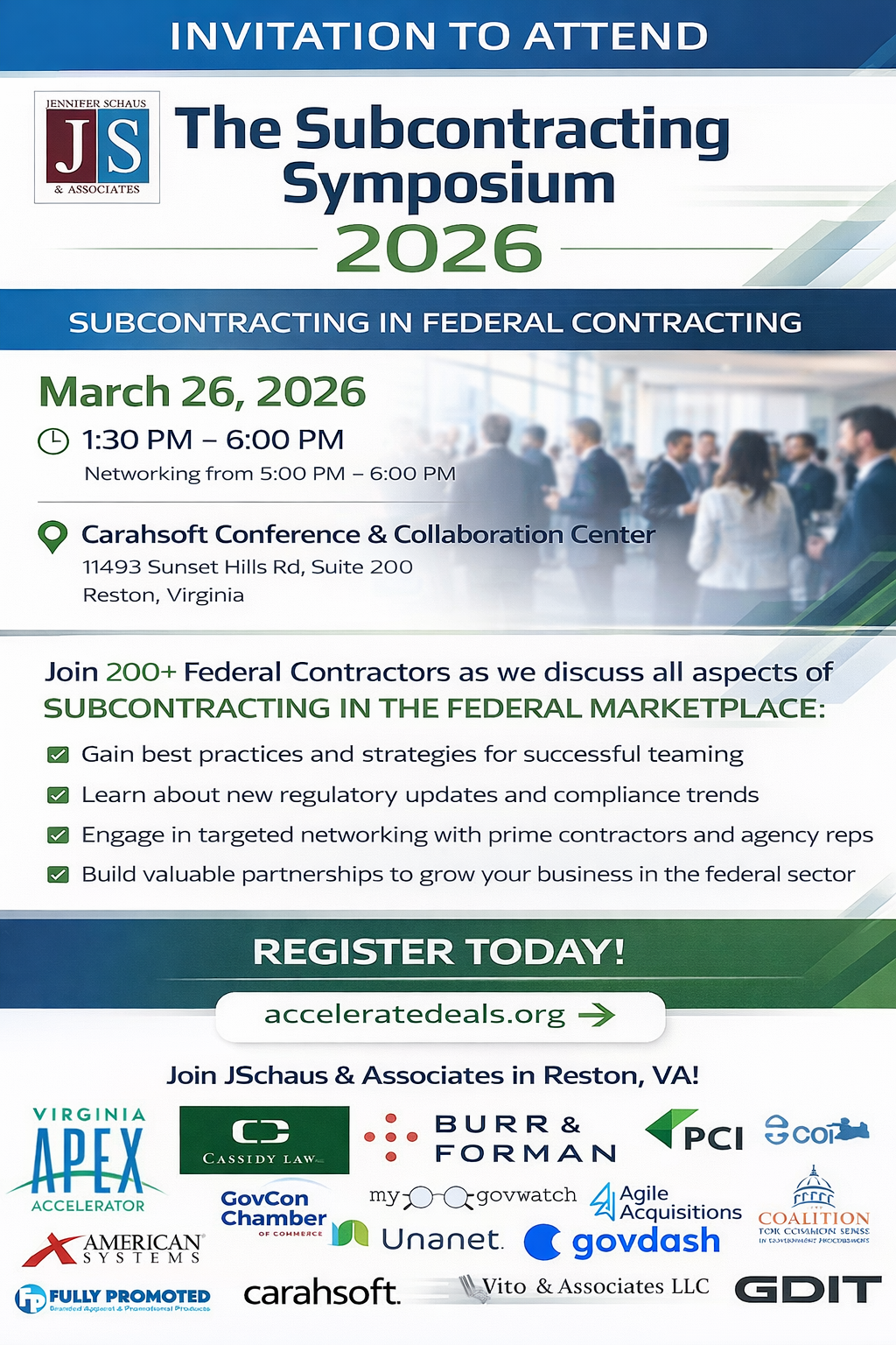You are cordially invited to attend The Subcontracting Symposium 2026, an exclusive industry gathering designed to convene leading federal contractors, business executives, and government contracting professionals for a high-impact discussion on subcontracting strategies within the federal marketplace.