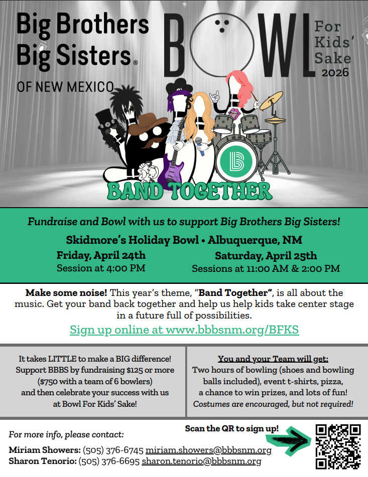 Big Brothers Big Sisters of New Mexico is excited to invite you to Bowl For Kids' Sake 2026! This signature event brings together local companies and community leaders to raise critical funds that fuel our life-changing youth mentorship programs. Bowl For Kids’ Sake will take place on Friday, April 24, and Saturday, April 25 at Skidmore’s Holiday Bowl in Albuquerque. This year’s theme, Band Together, reflects what makes this event so special—when we come together, young people across New Mexico thrive.