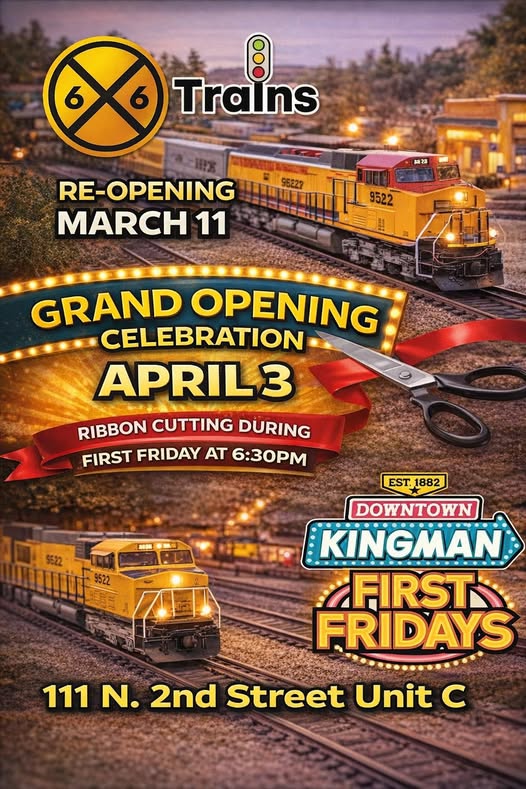 All aboard for the grand opening of 66 Trains in Downtown Kingman! Celebrate their official launch during First Friday with a festive evening featuring a ribbon cutting ceremony, community fun, and a unique train-themed atmosphere. Whether you're a rail enthusiast or just looking for a great night out, this is an event you won’t want to miss.