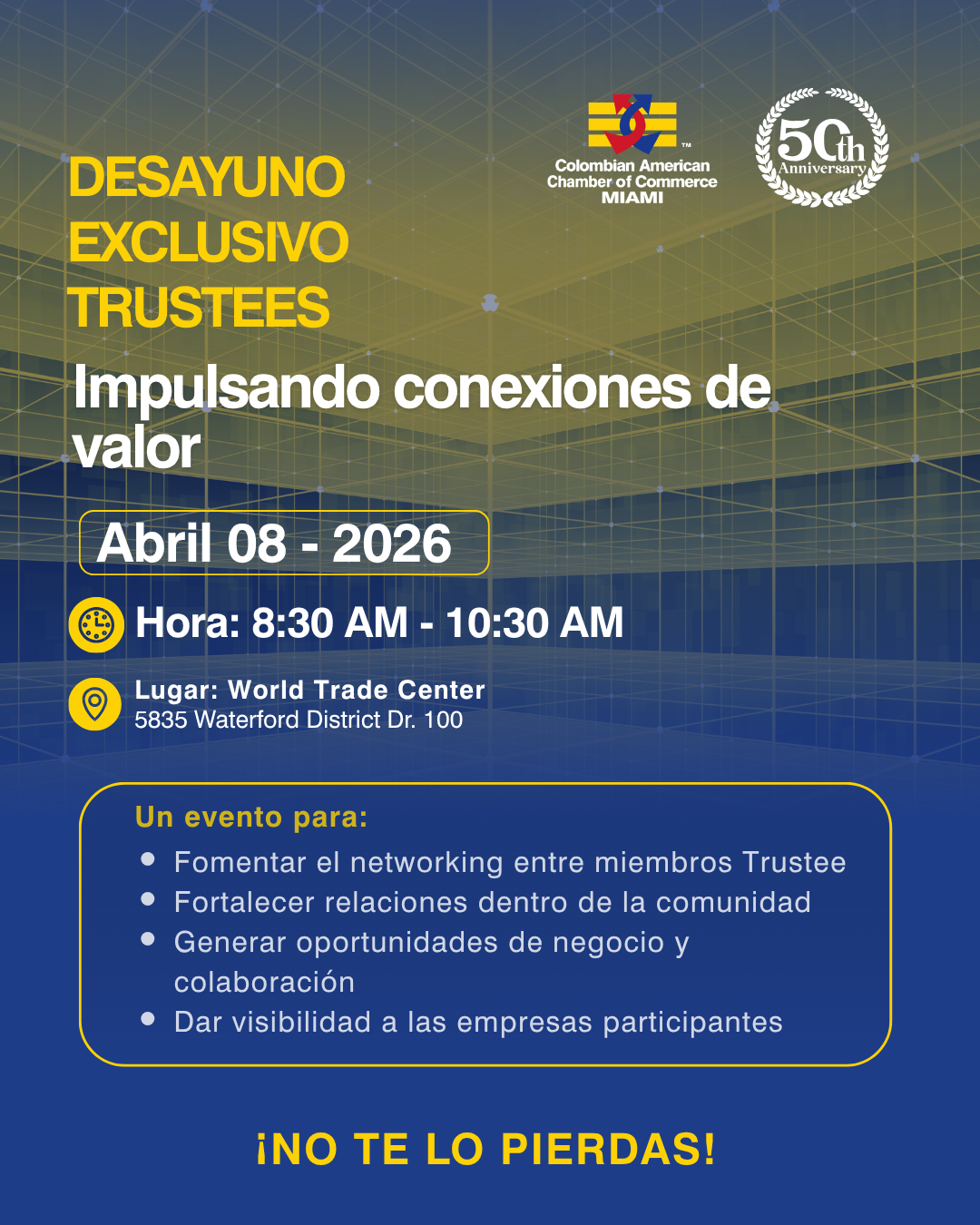 Acompáñanos en el Trustees Networking Breakfast – Board of Trustees de Colombian American Chamber of Commerce Miami, un espacio de encuentro exclusivo diseñado para fomentar el networking de alto nivel, fortalecer relaciones dentro de la comunidad y generar nuevas oportunidades de negocio y colaboración.