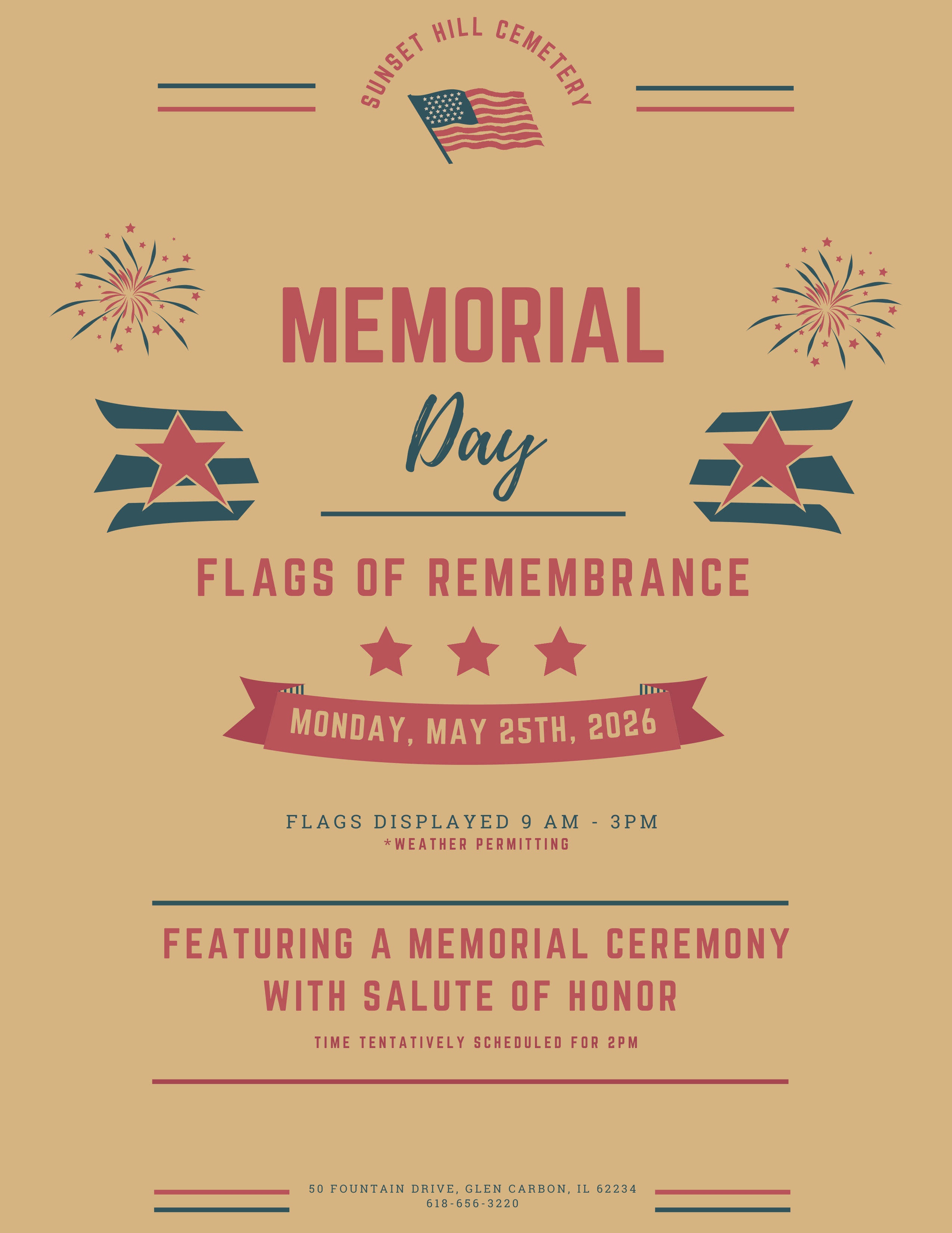 Sunset Hill Cemetery will be placing flags of remembrance on Memorial Day with a ceremony and salute of honor at 2PM. All are welcome to attend.