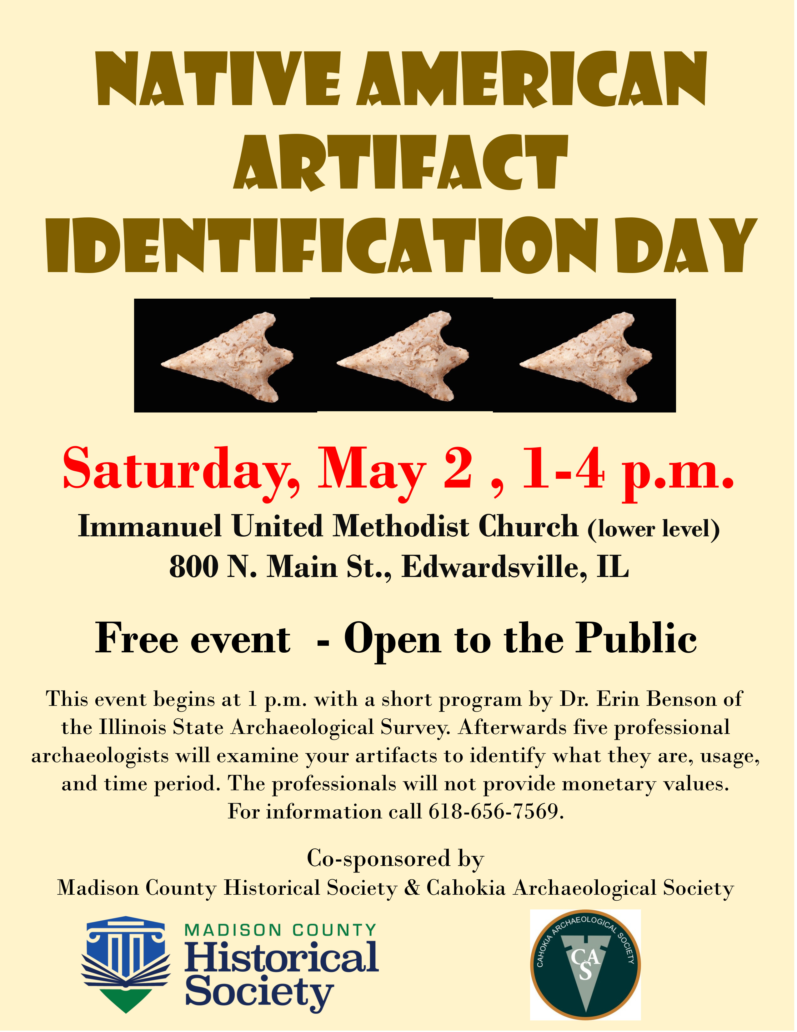 Do you have Native American artifacts that you want to learn more about? The Madison County Historical Society (MCHS) and the Cahokia Archaeological Society (CAS) are hosting an Artifact Identification Day on Saturday, May 2, from 1-4 p.m. at Immanuel United Methodist Church, 800 N. Main Street, in Edwardsville, Illinois. The event is in the lower-level Community Room on the south side of the church.