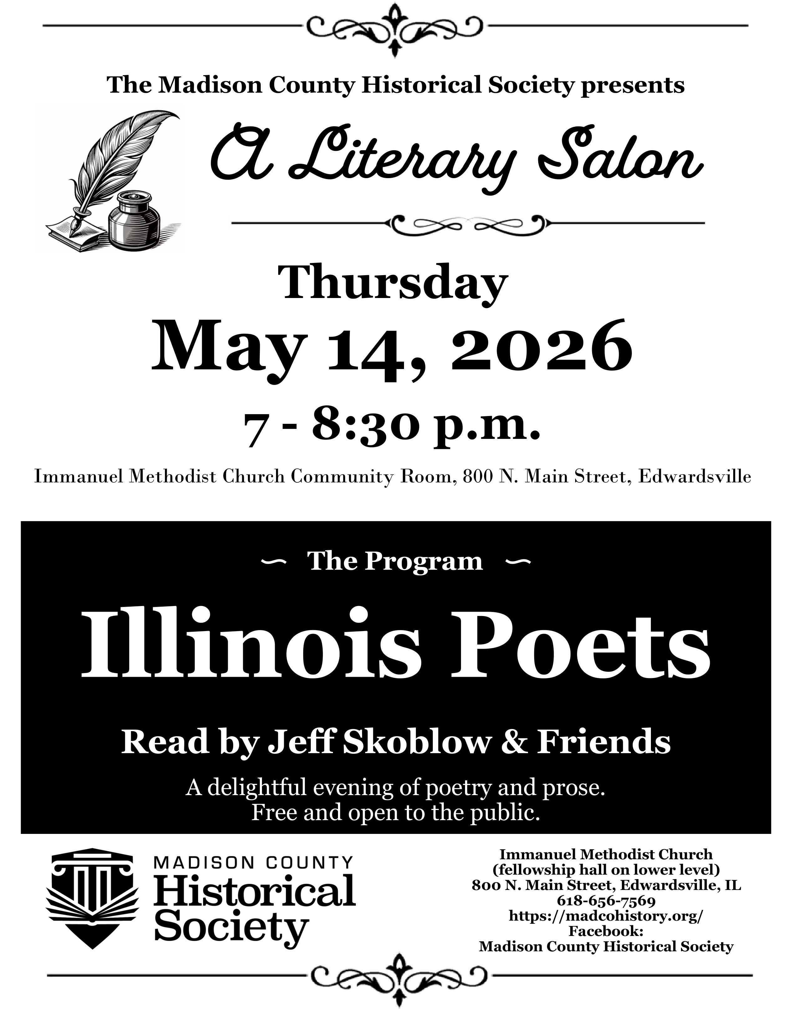 The Madison County Historical Society will host another Literary Salon on Thursday, May 14, at 7 p.m. in the Community Room of Immanuel United Methodist Church at 800 N. Main Street in Edwardsville, Illinois. The Community Room is on the lower level with entry on the south side of the building.