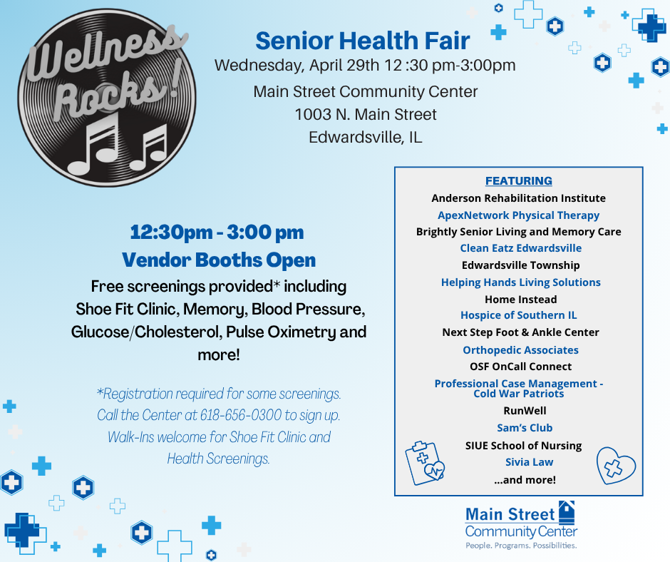 Join us for an afternoon focused on health, wellness, and community! From 12:30–3:00 PM, browse vendor booths and take advantage of free health screenings. Screenings include a Shoe Fit Clinic, memory screening, blood pressure checks, glucose and cholesterol testing, pulse oximetry, and more. Registration is required for some screenings, please call the Center at 618-656-0300 to sign up. Walk-ins are welcome for the Shoe Fit Clinic and health screenings. We look forward to seeing you!