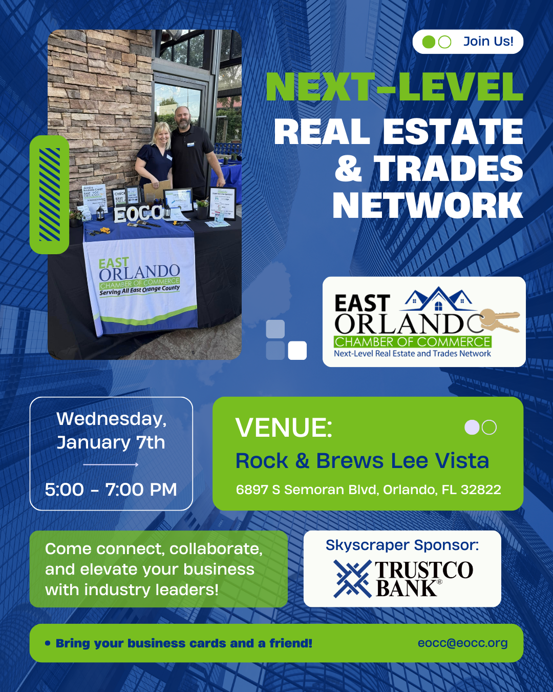 Next Level Real Estate and Trades Network presented by the East Orlando Chamber of Commerce, is dedicated to bringing industry professionals together with valuable referral sources and resources. This event fosters business growth and community development through dynamic networking opportunities, all in a fun, after-hours atmosphere.