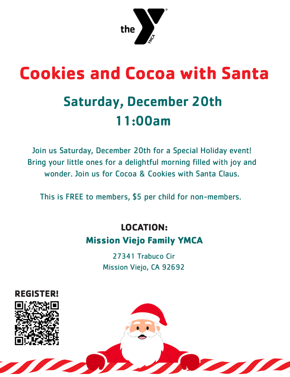 Kick off the holiday season with a delightful morning of Cookies & Cocoa with Santa. Families are invited to enjoy a delicious cookies, festive activities, and a cheerful visit from Santa himself. Bring your loved ones, your holiday cheer, and your camera to capture special memories and a fun seasonal surprise. This event will take place on Saturday, December 20th at 11:00 AM at the Mission Viejo Family YMCA. Guests of all ages are welcome to join in the holiday joy and celebration.