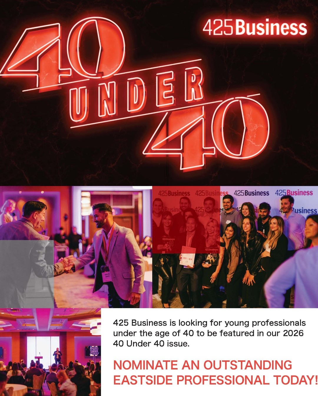 Join us Thursday, February 26 at Bellevue Arts Museum to honor our 425 Business 40 Under 40 honorees. 40 Under 40 is an inspiring event celebrating 40 accomplished business and community leaders under 40 years old who are thriving in their respective industries and making a mark on the Eastside and beyond.