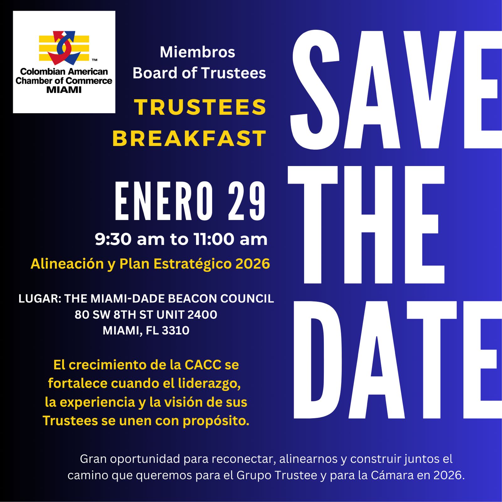 Acompáñanos en el Trustees Breakfast – Board of Trustees de Colombian American Chamber of Commerce Miami, un espacio de encuentro para fortalecer la alineación estratégica y construir juntos el plan 2026.