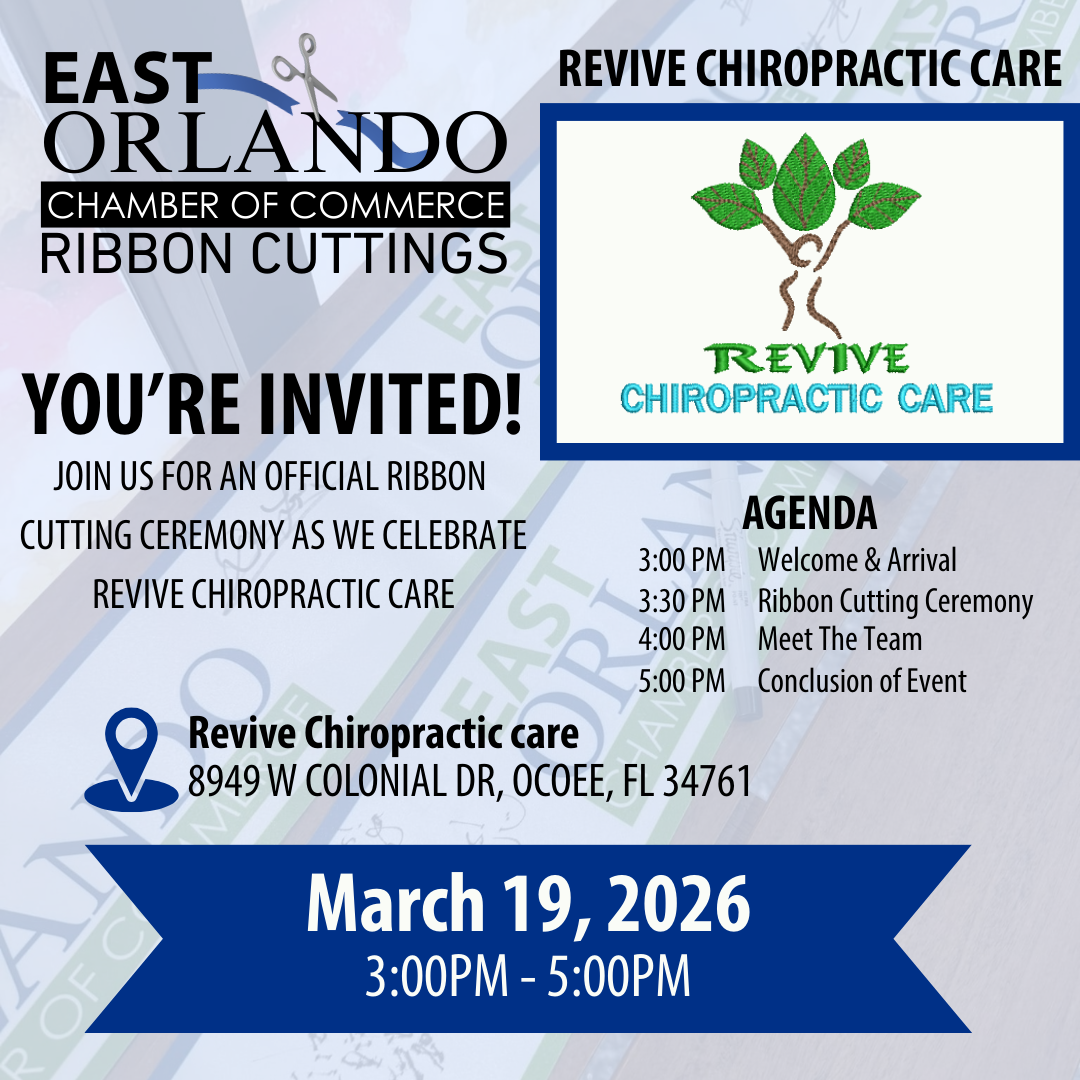 Join the East Orlando Chamber of Commerce as we celebrate the official ribbon cutting of Revive Chiropractic Care!
