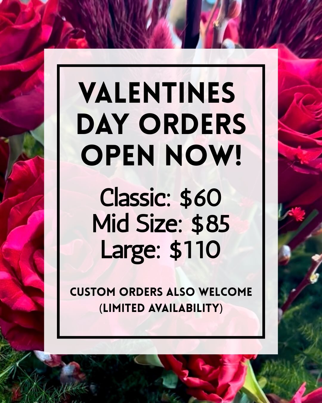 To guarantee flowers for Valentine’s Day, please place your order by February 10th.