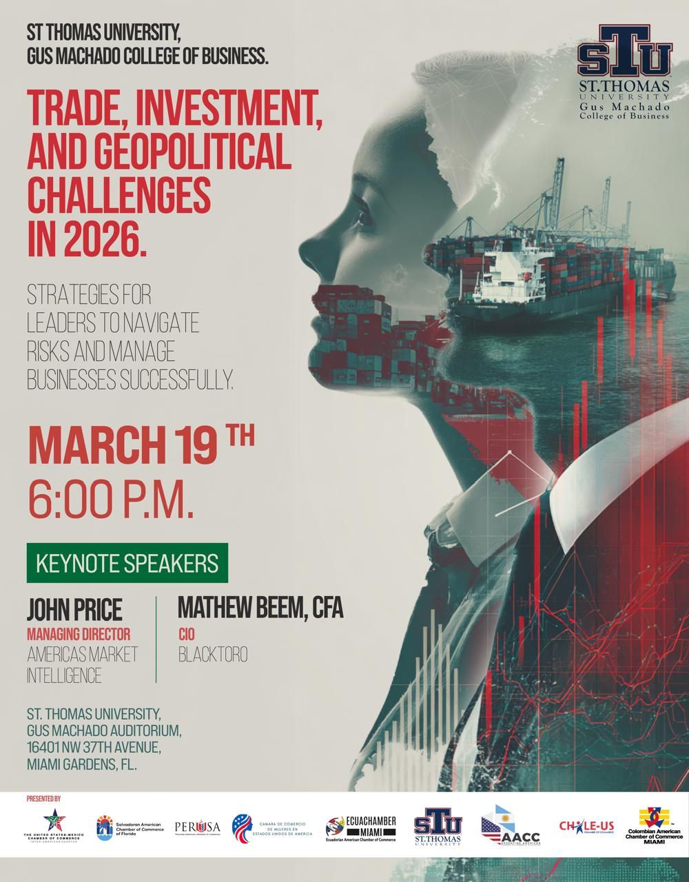Acompáñenos en la St. Thomas University, en el Gus Machado College of Business, para una velada de análisis y reflexión sobre Comercio, Inversión y Desafíos Geopolíticos en 2026, una conversación oportuna sobre cómo los líderes pueden tomar decisiones inteligentes en un entorno marcado por la incertidumbre.