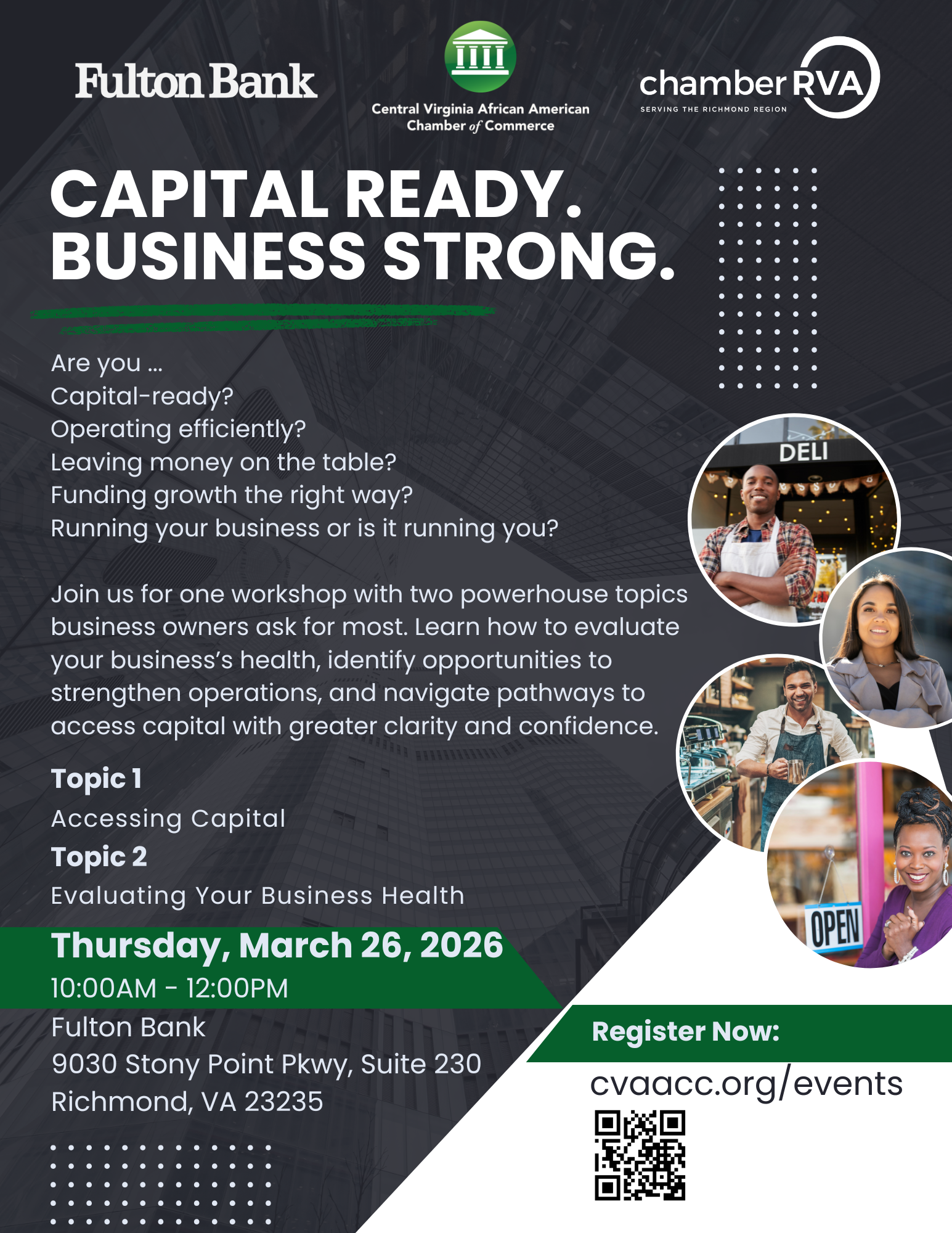 Join us for one workshop with two powerhouse topics business owners ask for most. Learn how to evaluate your business’s health, identify opportunities to strengthen operations, and navigate pathways to access capital with greater clarity and confidence.
